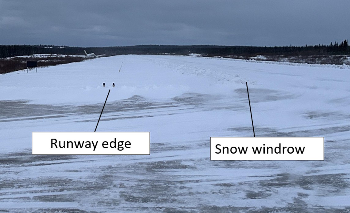 On the morning of 03 November 2023, the vehicle operator responsible for winter maintenance at Wemindji Airport (CYNC)All locations are in the province of Quebec, unless otherwise indicated., began his shift at 0800All times are Eastern Daylight Time (Coordinated Universal Time minus 4 hours). and was the only person working at the airport that day. Given that snow had fallen overnight, he began to remove snow from the runway.CYNC has a single runway, Runway 10/28. He did this in an asymmetrical pattern, over a width of approximately 65 feet, leaving 2 windrows, each about 18 inches high. One windrow was encroaching 23 feet onto the southern edge of the runway, while the other was encroaching 12 feet onto the northern edge of the runway. Estimating that the snow had been sufficiently removed, he moved on to other tasks in preparation for flights happening that day.