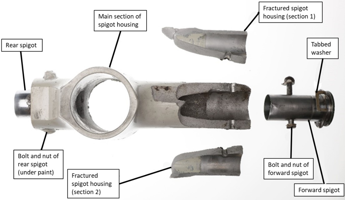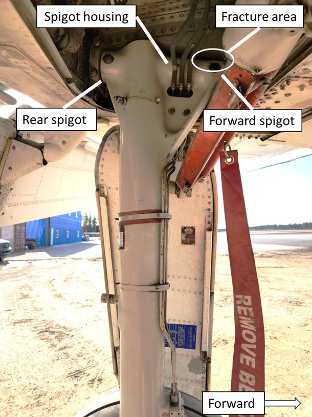 The aircraft remained upright during the landing but was substantially damaged (Figure 1) when the left MLG unit collapsed as a result of a failed spigot housing.In 3 of the main service bulletins (SBs) related to the maintenance of the MLG (SB 32-A-JA 851226, SB 32-19, and SB 32-JM7862), the term “spigot housing” is used. This term is used throughout this report. However, this structural component of the MLG is also referred to as the “pintle” or “yoke pintle” in other sources, including SB 32-A-JA 140940, SB 32-56, SB 32-JA960142, and European Union Aviation Safety Agency (EASA) Airworthiness Directive (AD) 2016-0224. For the full titles of these sources, refer to section 1.18.2 Current airworthiness directives and service bulletins related to the main landing gear in Jetstream 3100 series aircraft in this report. The left MLG unit, wing tip, propeller, and engine were significantly damaged, as was the belly cargo pod.