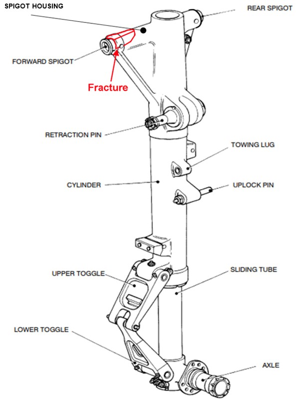 During the aircraft’s landing, several cracks in the spigot housing of the left MLG unit grew, to the point where the structure of the MLG unit failed. The cracks likely propagated because the material used was susceptible to SCC, and it was exposed to both tensile stress and a corrosive environment.