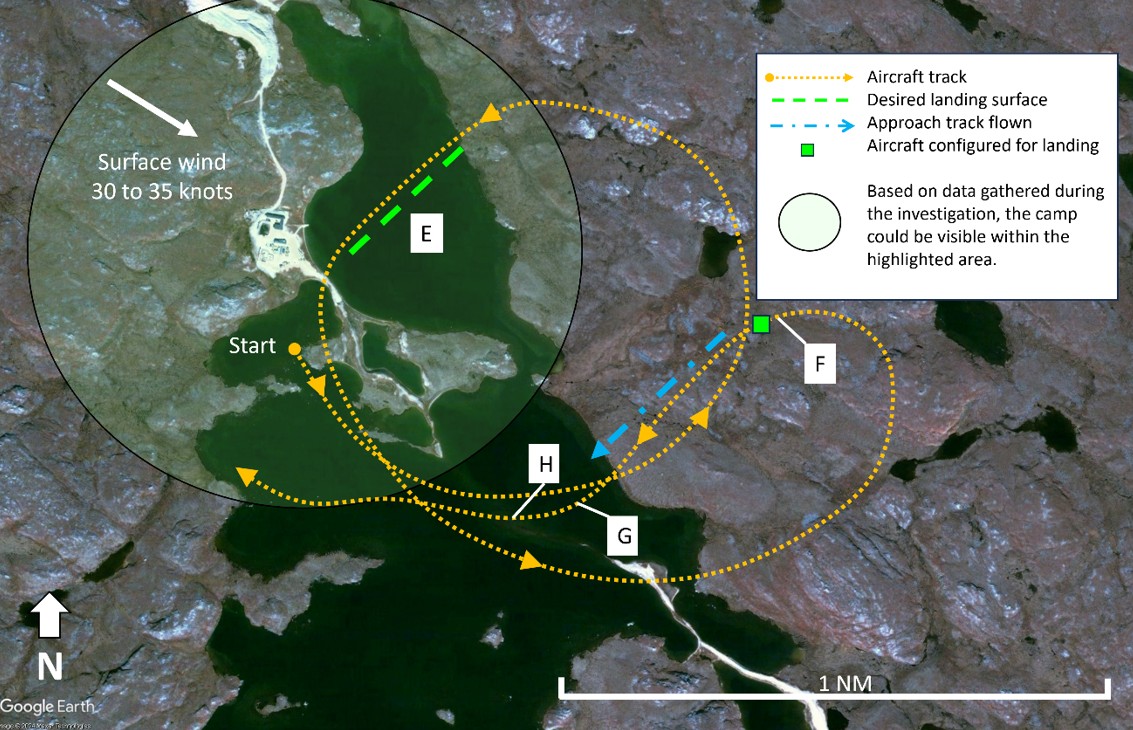 The occurrence aircraft conducted a 2nd orbit of the desired landing area to determine an appropriate heading for an improvised omni-bearing selector (OBS) approach.Section 1.17.7.4.2 Omni-bearing selector approach/heading approach of the report contains more information on this improvised instrument approach procedure. The flight crew agreed it would be best to conduct an improvised OBS approach to a new desired landing surface on a heading of 220°M (E on Figure 3). Approximately 1 NM to the east of the new desired landing surface, at an altitude of 290 feet AGL, a left turn was initiated, and the aircraft rolled out on an approach heading of 220°M (F on Figure 3) at approximately 155 feet AGL without compensating for the strong westerly winds. Once the turn was complete, the aircraft was aligned ½ NM to the southeast of the desired landing surface. The aircraft was configured for landing (green square on Figure 3) and continued the improvised instrument approach to between 100 and 50 feet AGL. With the aid of his EFB, the PM determined the aircraft was not aligned with the desired landing surface, and a go-around was initiated (G on Figure 3). During the go-around, at approximately 120 feet AGL, the flight crew entered instrument meteorological conditions (IMC)IMC or instrument meteorological conditions means meteorological conditions less than the minima specified in Part VI, Subpart 2, Division VI of Transport Canada’s Canadian Aviation Regulations (CARs) for visual meteorological conditions, expressed in terms of visibility and distance from cloud. and were unable to determine their position visually (H on Figure 3) (Table 2).