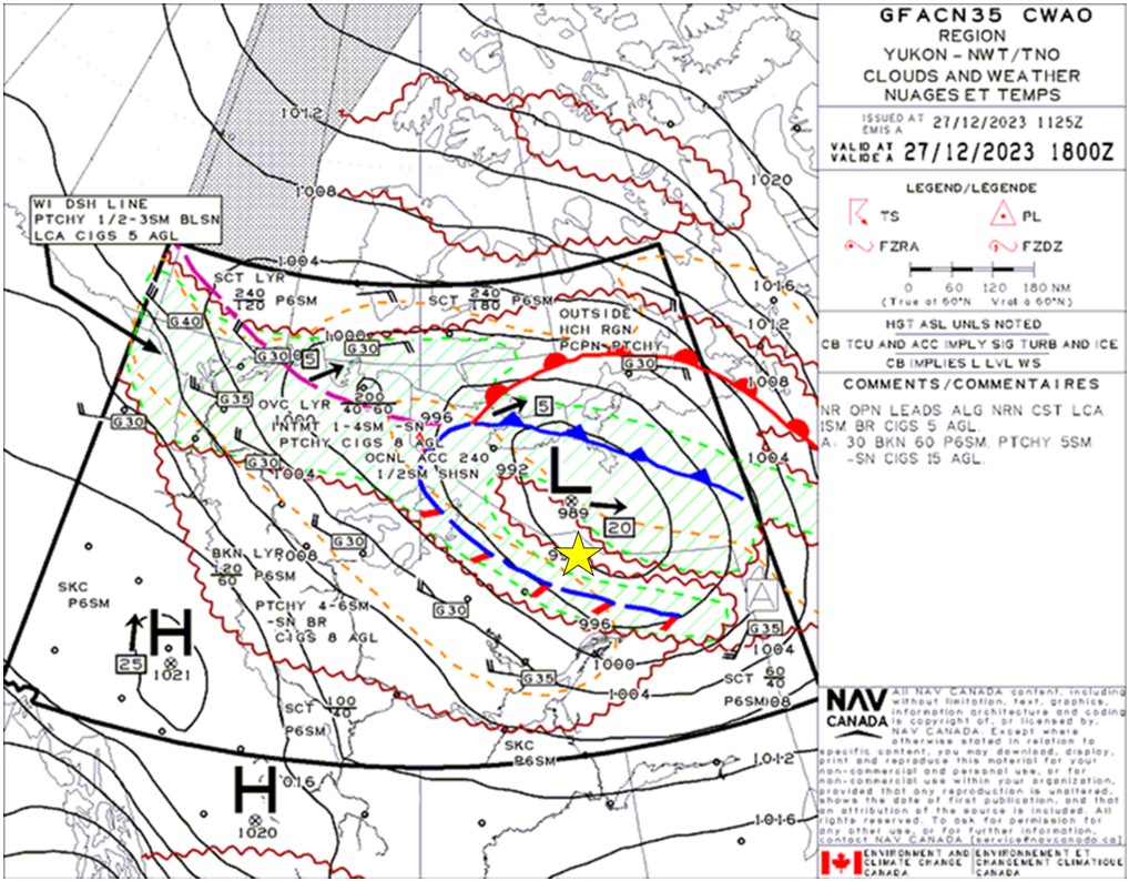 Appendix A – Graphic area forecast – Clouds and Weather Chart GFACN35 issued at 0425 Mountain Standard Time on 27 December 2023 (yellow star denotes accident site)