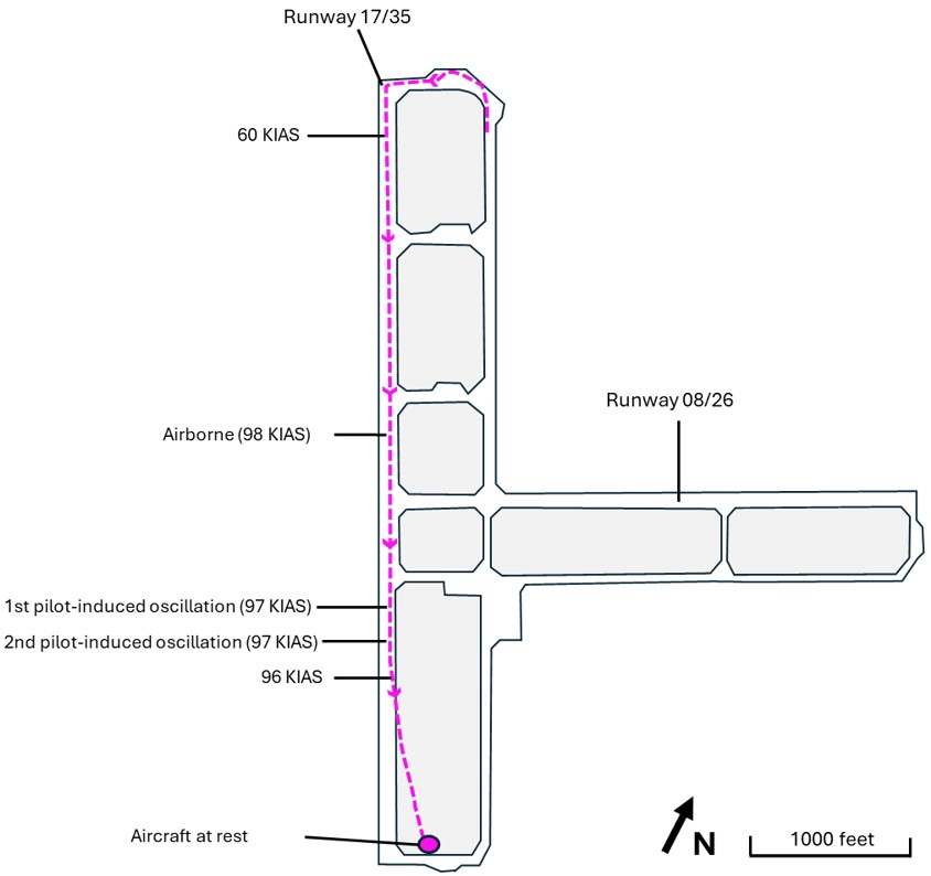 During the 2nd attempt, the aircraft gained approximately 10 to 20 feet of height and reached a maximum speed of 98.4 KIAS. When the aircraft passed the threshold for Runway 08, and at an airspeed of 97 KIAS, the pilot aborted the takeoff because he again perceived the aircraft performance to be lower than anticipated. The aircraft descended and contacted Runway 17, nose landing gear first. The aircraft subsequently bounced, became airborne again, entered a pilot-induced oscillation (PIO),See the section titled Pilot-induced oscillation in this report for a description of this phenomenon. and drifted to the left of the paved runway surface. The aircraft descended and impacted the grass area on the left (east) side of Runway 17 (Figure 1).