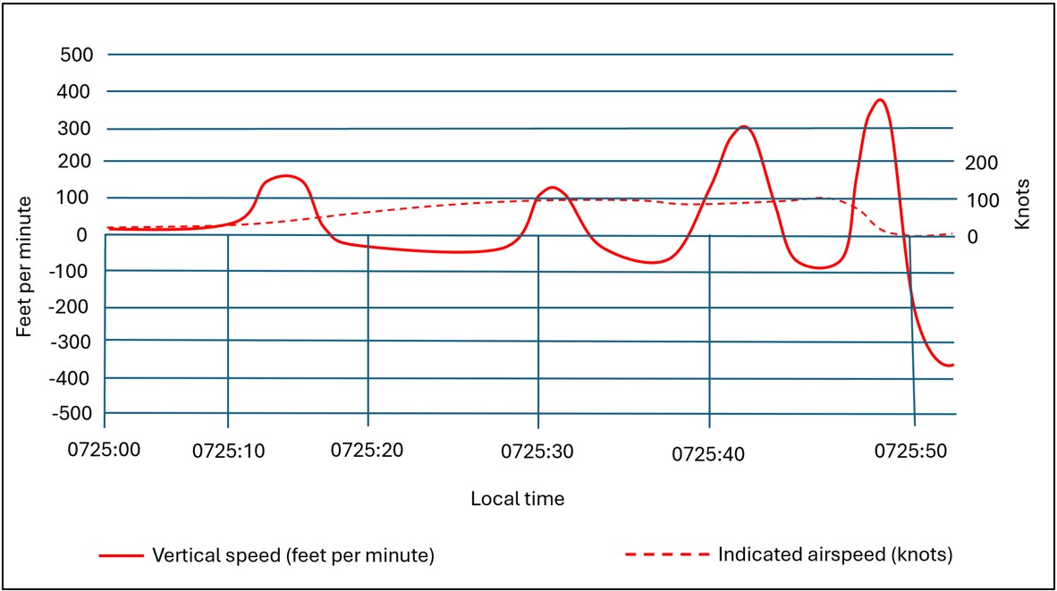 PIO, also known as porpoising, can present a notable challenge to pilots during the landing phase of a flight. As explained by the U.S. Federal Aviation Administration (FAA) in its Airplane Flying Handbook, “[i]n a bounced landing that is improperly recovered, the airplane comes in nose first, initiating a series of motions imitating the jumps and dives of a porpoise.”Federal Aviation Administration (FAA), FAA-H-8083-3C, Airplane Flying Handbook (2021), Chapter 9: Approaches and Landings, p. 9-34. As was the case in the occurrence flight (Figure 3), the series of oscillations involves an increase in amplitude.