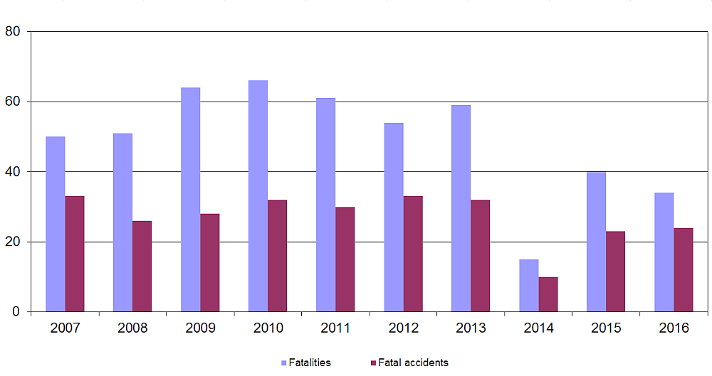 The number of fatalities (34), was lower than the 2015 total of 40, and lower than the 5-year average of 46 and the 10-year average of 51. The number of serious injuries (16) was lower than the 2015 total of 29, the 5-year average of 32, and the 10-year average of 36.