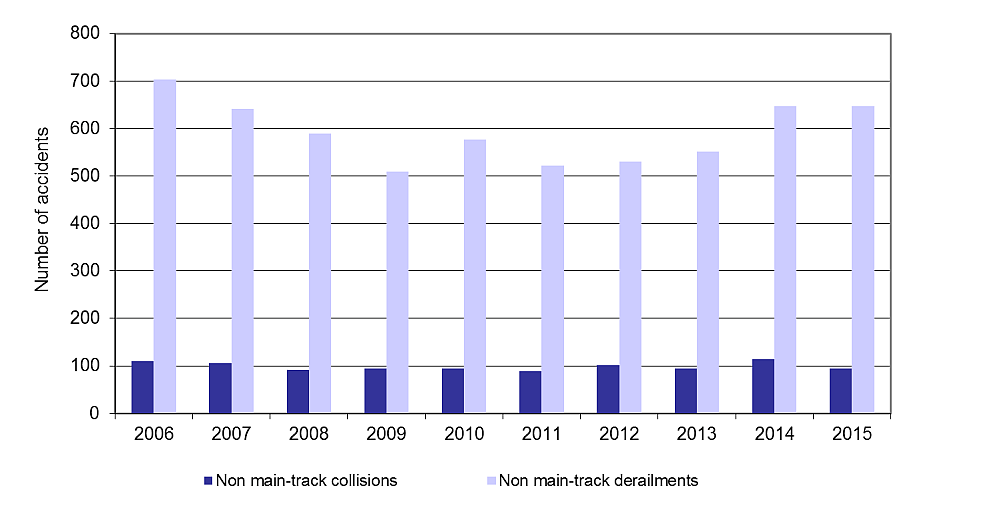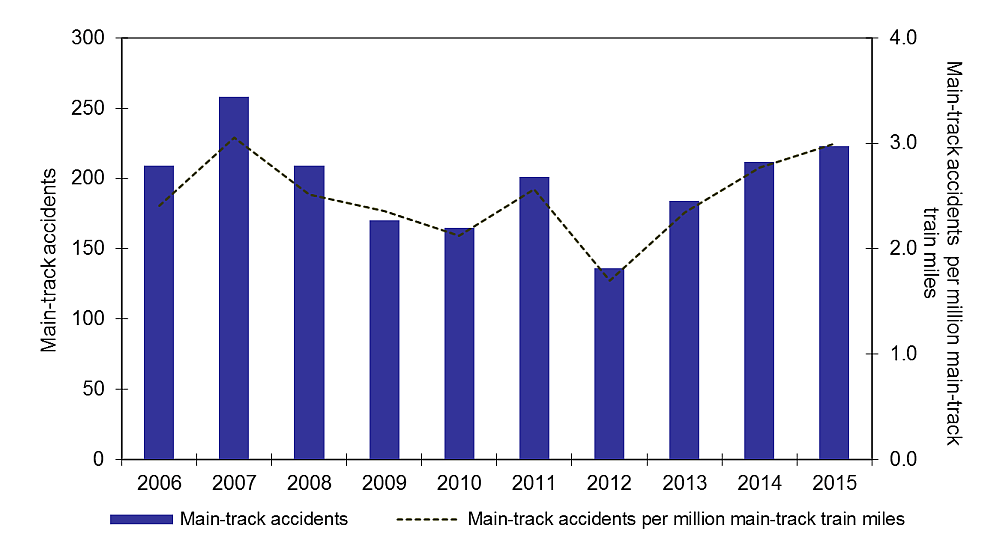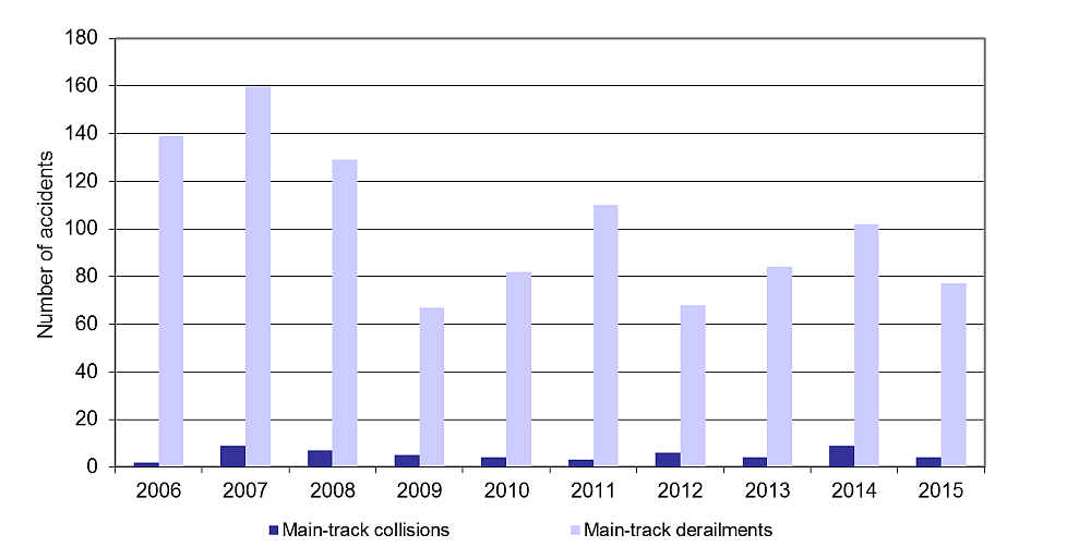 Main-track derailments and collisions accounted for 7% of all accidents in 2015, compared with 9% in the previous year.