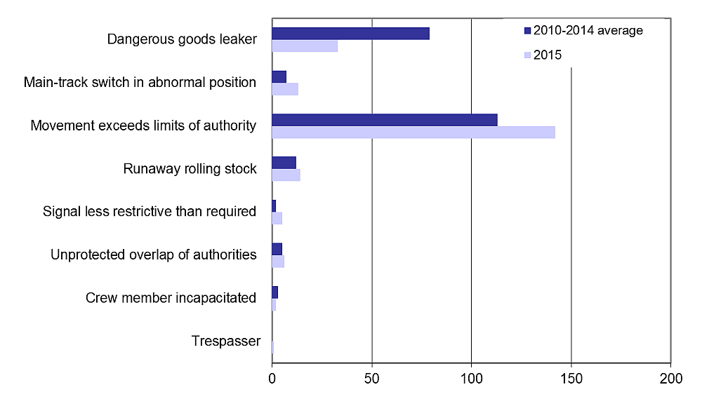 In 2015, there were 216 reported rail incidents (Figure 11), which is comparable to 218 in 2014 and the 5-year average of 220. Incidents of the type “movement exceeds the limit of authority” Footnote 12 (66% of reportable incidents) were the main type of incident, as it has been since 2006, followed by dangerous goods leakers (15%), runaway rolling stock (6%), and main-track switch in abnormal position (6%).