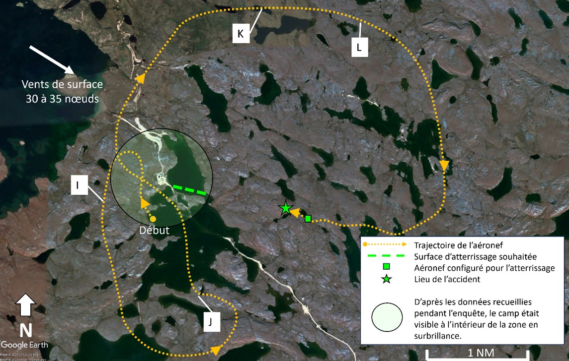 Pendant que l’aéronef remontait jusqu’à environ 300 pieds AGL, l’équipage de conduite a commencé à programmer une nouvelle approche improvisée sur un axe central prolongé dans l’OEPP. L’aéronef a amorcé un circuit vers la gauche (point « I » sur la figure 4) pour une 3e approche en vue d’un atterrissage en direction nord. Pendant le virage de l’étape vent arrière vers l’approche finale, l’aéronef a dépassé la trajectoire vers le nord souhaitée, mais l’a ensuite interceptée en utilisant une approche établie sur l’OEPP (point « J » sur la figure 4). Incapable de voir le lac, l’équipage de conduite s’est fié à l’OEPP pour obtenir des données sur sa position. Après avoir aperçu le camp routier à une distance d’environ ½ NM, l’équipage de conduite a déterminé que les vents de travers étaient trop forts pour poursuivre l’atterrissage en direction nord, et l’aéronef a de nouveau effectué une remise des gaz et dépassé le camp routier.