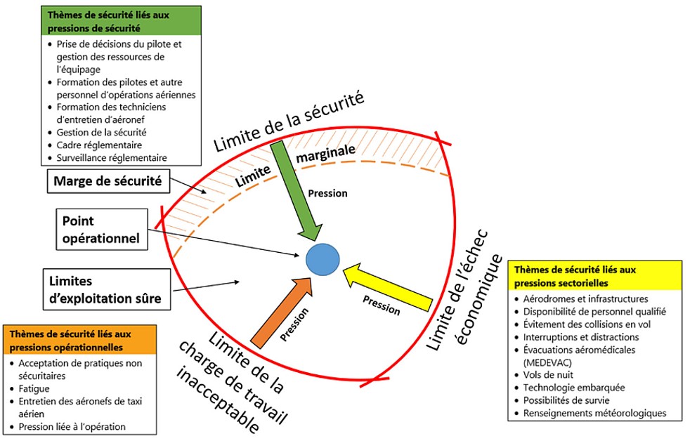 Le concept des limites d’exploitation sûre présenté par le BST dans son SII sur les activités de taxi aérien explique comment le fait que les activités d’Air Tindi soient soumises à des pressions sectorielles et opérationnelles a conduit à l’adoption de pratiques non sécuritaires. Les pressions en matière de sécurité qui auraient normalement dû contrebalancer les pressions opérationnelles se sont avérées inefficaces dans le contexte de l’événement à l’étude, et ce, pour les raisons suivantes :