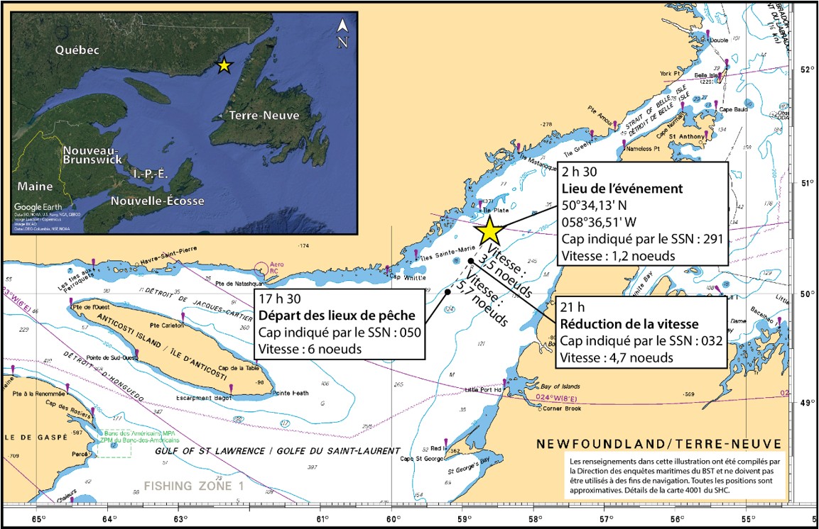 D’après les données du système de surveillance des naviresPêches et Océans Canada, « Système de surveillance des navires national », à l’adresse https://www.dfo-mpo.gc.ca/fisheries-peches/sdc-cps/vessel-monitoring-surveillance-navire/index-fra.html (dernière consultation le 16 octobre 2025). (SSN), à 17 h 30, le bateau se dirigeait vers son port d’attache à un cap de 050° vrais (V) et à une vitesse sur le fond de 6 nœuds. Les vents dans la zone de navigation étaient légers.