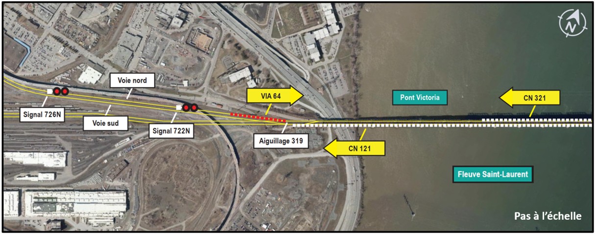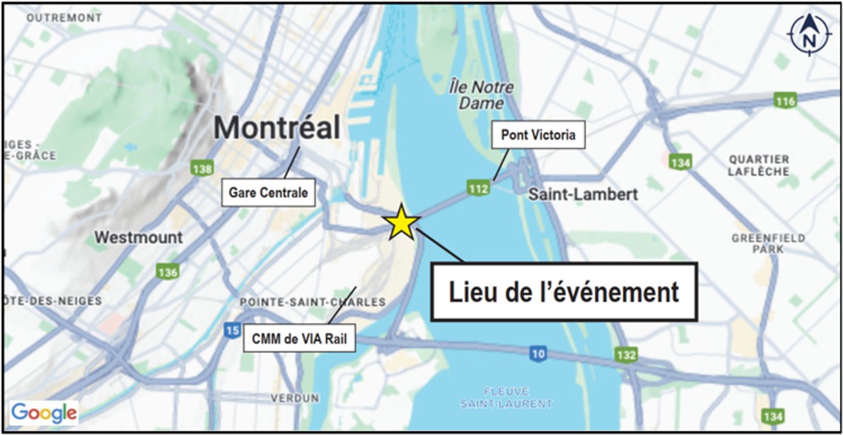 Le train a effectué son parcours selon l’horaire habituel et est entré en gare vers 17 h à Montréal. Après que les passagers et les membres du personnel de bord sont descendus du train, l’équipe a reçu la permission d’amener le train au centre de maintenance de Montréal (CMM) de VIA situé à proximité des voies de la gare Centrale. Lors de cette manœuvre de routine, le train doit reculer jusqu’au pont Victoria et emprunter les voies de liaison menant vers le CMM (figure 1).