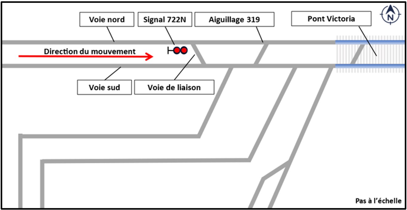 Le 29 septembre 2024, vers 17 h 16, l’équipe du VIA 64 effectuait une manœuvre de pousse entre la gare Centrale de Montréal en direction du pont Victoria sur la subdivision de St-Hyacinthe. Le train était manœuvré depuis la locomotive de tête par un mécanicien de locomotive aux commandes (ML), et un MLR était à bord de la voiture de queue afin de protéger le mouvement. Vers 17 h 25, le train s’est arrêté sur la voie nord, à un peu plus de 300 pieds du signal 722N, qui présentait une indication d’arrêt absolu. Environ 8 minutes plus tard, le MLR a indiqué au ML qu’il avait de la difficulté à confirmer la couleur du feu supérieur du signal 722N. Il a demandé au ML de reculer le train sur une distance de 2 voitures afin de se rapprocher du signal pour lui permettre d’en confirmer l’aspect. Alors que la queue du train se rapprochait du signal 722N, le MLR a perçu que le feu supérieur du signal présentait une coloration jaune. Il a alors interprété que le signal présentait une indication permissive de vitesse moyenne à arrêt. Il en a informé le ML par radio et lui a demandé de poursuivre la manœuvre de pousse. Le train a franchi le signal 722N qui présentait une indication d’arrêt absolu et a parcouru une distance de 1500 pieds au-delà de ce signal. À l’approche de l’aiguillage de la voie principale à l’extrémité ouest du pont Victoria, le MLR a constaté que ce dernier n’était pas orienté pour son train et a immédiatement demandé au ML d’arrêter le train. Lorsque le train s’est immobilisé, le bogie à l’extrémité de la voiture de queue avait talonné l’aiguillage.