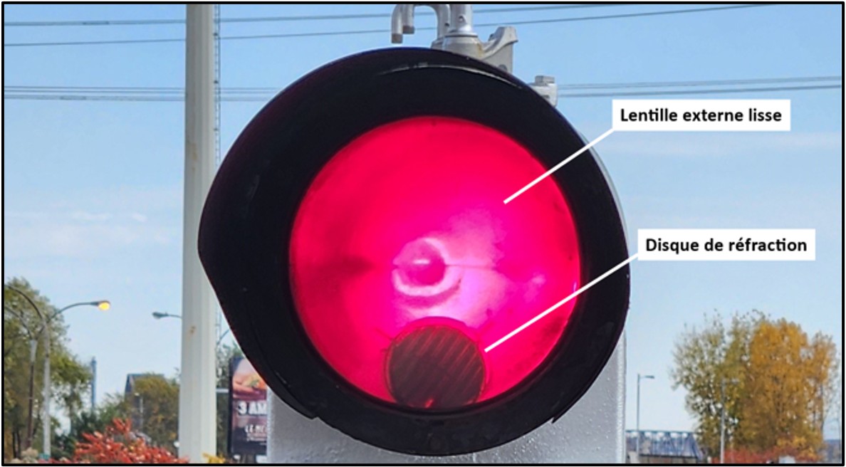 Le feu supérieur est équipé d’une lentille externe lisseCe type de lentille est généralement utilisé aux endroits où la voie d’approche du signal est en tangente sur une distance de 1000 pieds ou plus. combinée à un disque de réfraction placé derrière la lentille (figure 7). Une lentille lisse génère une réflexion spéculaire, qui agit comme un miroir en reflétant la lumière incidente du soleil de manière directionnelle.