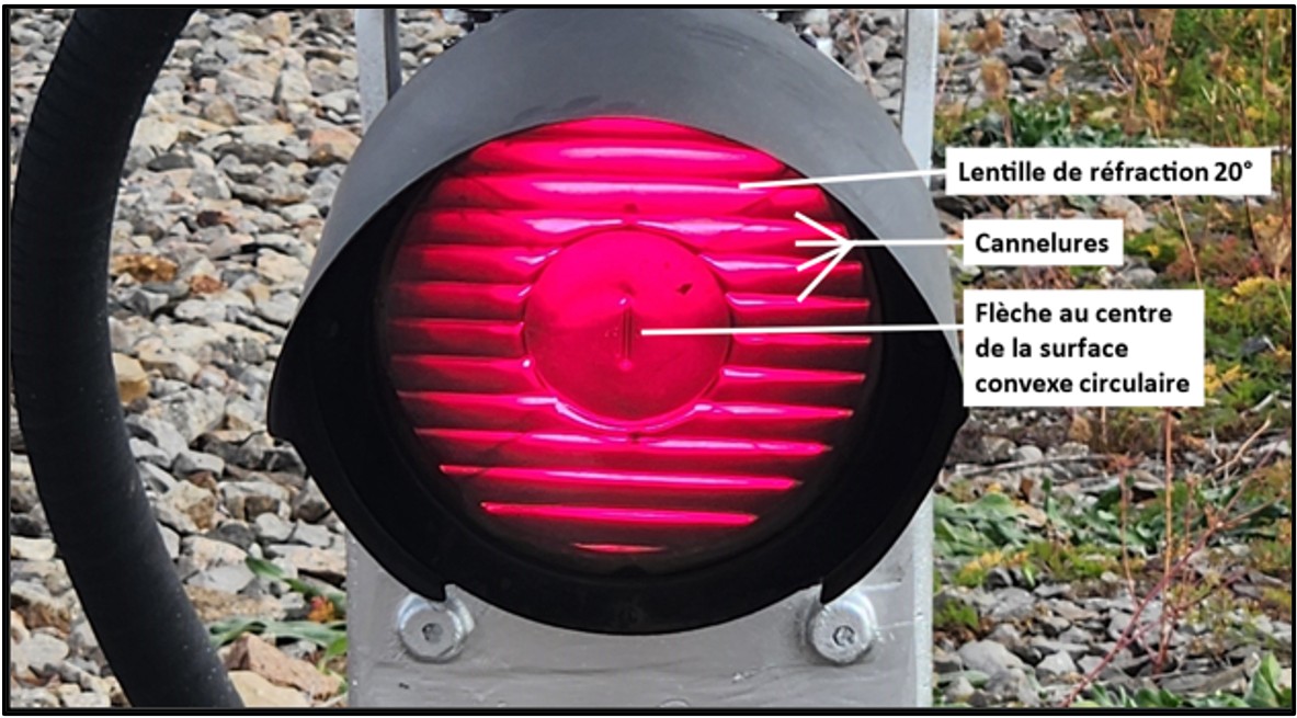 - Les feux du signal 722N sont munis de 2 types de lentilles qui réfléchissent différemment la lumière incidente du soleil sur leur surface.