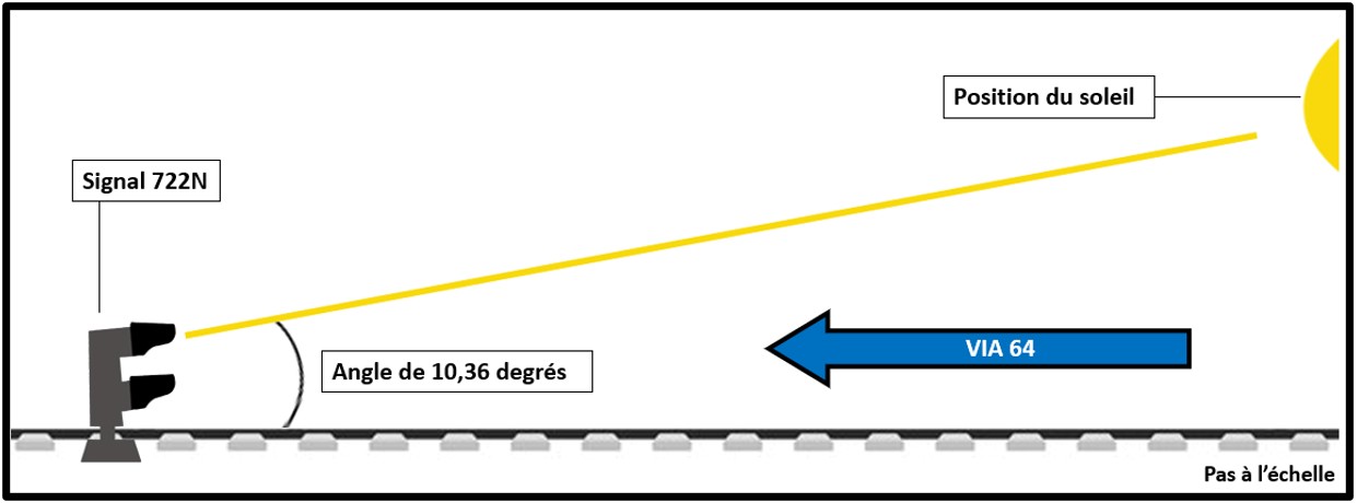 Lors de l’événement, au signal 722N, le soleil se trouvait à une altitude de 10,36°À cette faible altitude, à l’approche du coucher du soleil, la lumière prend des teintes orangées et rougeâtres en raison de la diffusion atmosphérique, qui peut varier en fonction des conditions d’humidité, de température, de pression et de présence de particules dans l’air. au-dessus de l’horizon et à un azimut de 255,11°. Selon les données des caméras de surveillance du ministère des Transports et de la Mobilité durable du Québec et du REM, ainsi que la caméra orientée vers l’avant de la locomotive de tête du VIA 64, le ciel était dégagé, le soleil faisait face au signal et éclairait directement ses lentilles (figure 9).