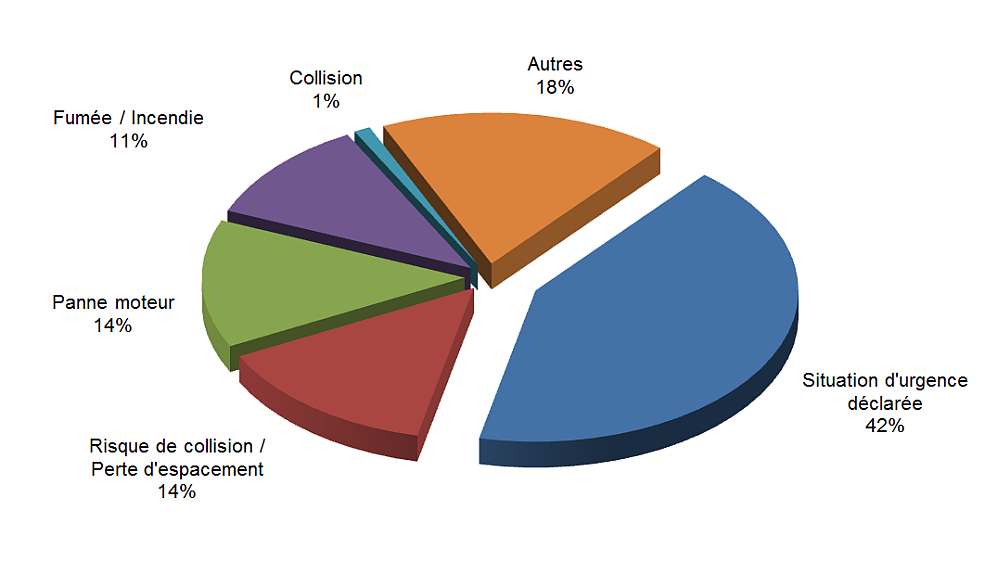 Les incidents les plus fréquents en 2015 pour tous les aéronefs immatriculés au Canada et à l’étranger sont les déclarations d’une situation d’urgence (42 %), les pannes moteur (14 %) et les risques de collision ou les pertes d’espacement (14 %) (figure 7).