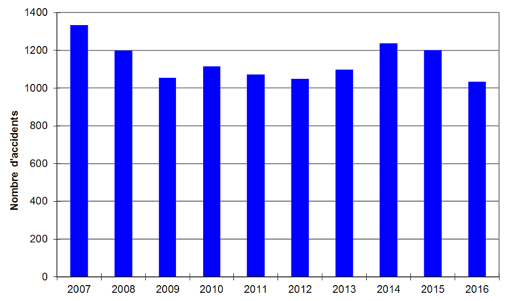 En 2016, 1035 accidents ferroviaires Note de bas de page 1 ont été signalés au BST (figure 1), ce qui constitue une baisse de 14 % par rapport aux 1201 accidents signalés en 2015, une baisse de 9 % par rapport à la moyenne de 1132 accidents de 2011 à 2015, et une baisse de 12 % par rapport à la moyenne de 1173 accidents de 2006 à 2015.
