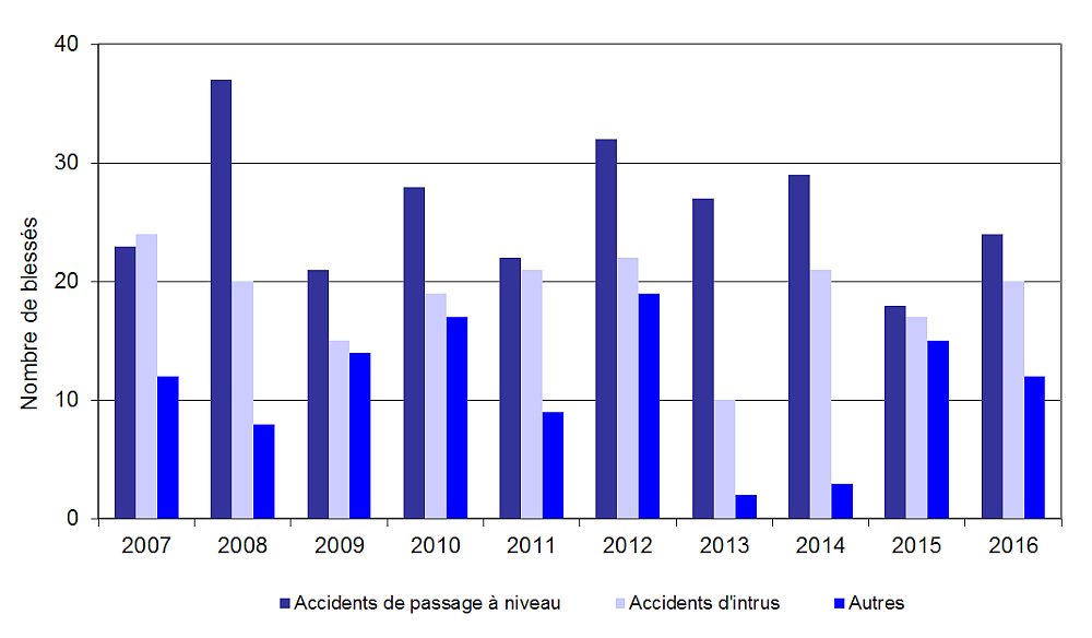 Il y a eu 133 accidents aux passages à niveau en 2016, ce qui correspond à une baisse de 19 % par rapport au total de 165 enregistré en 2016 et de 26 % par rapport à la moyenne quinquennale de 179. Le nombre d'accidents aux passages à niveau publics dotés de dispositifs de signalisation automatiques (69) a diminué de 13 % par rapport à 2015 (79) et de 25 % par rapport à la moyenne quinquennale de 92. Le nombre d'accidents aux passages à niveau publics passifs (36) a diminué de 31 % par rapport à 2015 (52) et de 43 % par rapport à la moyenne quinquennale de 63. Le nombre d'accidents aux passages à niveau privés et de ferme (28) a diminué de 18 % par rapport à 2015 (34), mais constitue une hausse de 15 % par rapport à la moyenne quinquennale de 24.
