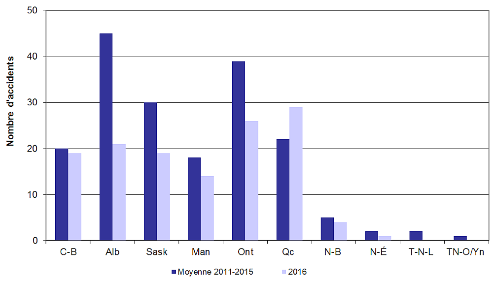 En 2016, 13 % des accidents ferroviaires ont concerné des véhicules ou des piétons à des passages à niveau, un taux légèrement en baisse par rapport à la moyenne quinquennale de 16 %. La proportion des autres types d'accidents Note de bas de page 3 (16 %) en 2016 est en hausse comparativement à la moyenne quinquennale de 11 %.