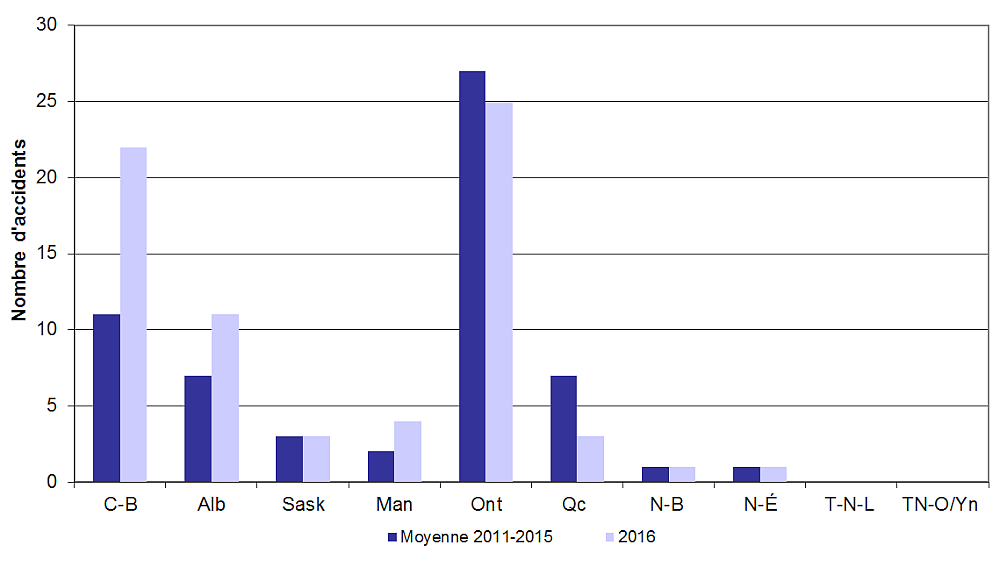 En 2016, 36 % de tous les accidents liés à des intrus sont survenus en Ontario (25), suivi de la Colombie-Britannique avec 31 %. C'est en Alberta que se sont produits 16 % de tous les accidents survenus à des intrus (figure 10).