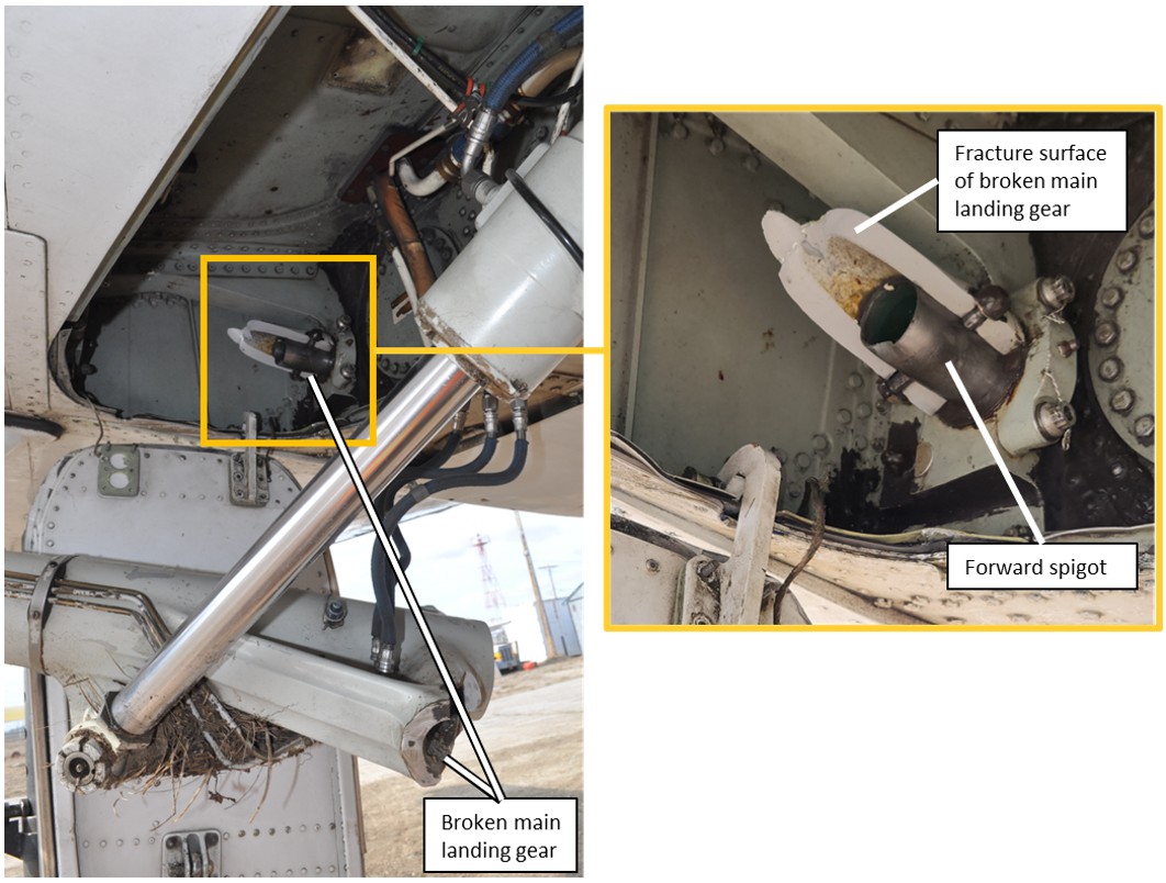 The aircraft remained upright during the landing but was substantially damaged (Figure 1) when the left MLG unit collapsed as a result of a failed spigot housing.In 3 of the main service bulletins (SBs) related to the maintenance of the MLG (SB 32-A-JA 851226, SB 32-19, and SB 32-JM7862), the term “spigot housing” is used. This term is used throughout this report. However, this structural component of the MLG is also referred to as the “pintle” or “yoke pintle” in other sources, including SB 32-A-JA 140940, SB 32-56, SB 32-JA960142, and European Union Aviation Safety Agency (EASA) Airworthiness Directive (AD) 2016-0224. For the full titles of these sources, refer to section 1.18.2 Current airworthiness directives and service bulletins related to the main landing gear in Jetstream 3100 series aircraft in this report. The left MLG unit, wing tip, propeller, and engine were significantly damaged, as was the belly cargo pod.