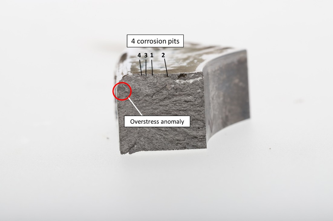 A corrosive environment likely entered the spigot housing of the left MLG unit at the overstress anomaly (the dark circular feature) and the 4 corrosion pits and associated fatigue zones. Evidence of intergranular cracking appeared at all 3 fracture locations in the spigot housing, and it is likely that the failure mechanism transitioned to stress corrosion cracking (SCC).