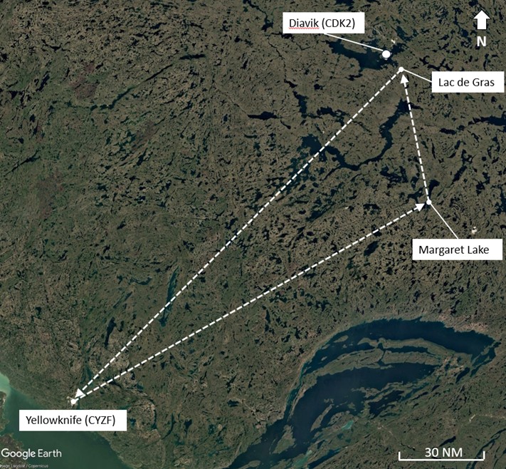 On 27 December 2023, two Air Tindi Ltd. (Air Tindi) De Havilland Inc. DHC-6 Twin Otter Series 300 (Twin Otter) aircraft were scheduled to depart Yellowknife Airport (CYZF)All locations mentioned in this report are in the Northwest Territories, unless otherwise noted. at 1000.All times are Mountain Standard Time (Coordinated Universal Time minus 7 hours). The Twin Otters were tasked with transporting workers and supplies to camps at Margaret Lake and Lac de Gras. After landing at Margaret Lake, one Twin Otter was to return to CYZF, and the occurrence aircraft, C-GMAS, would continue to land at Lac de Grasand then return to CYZF.