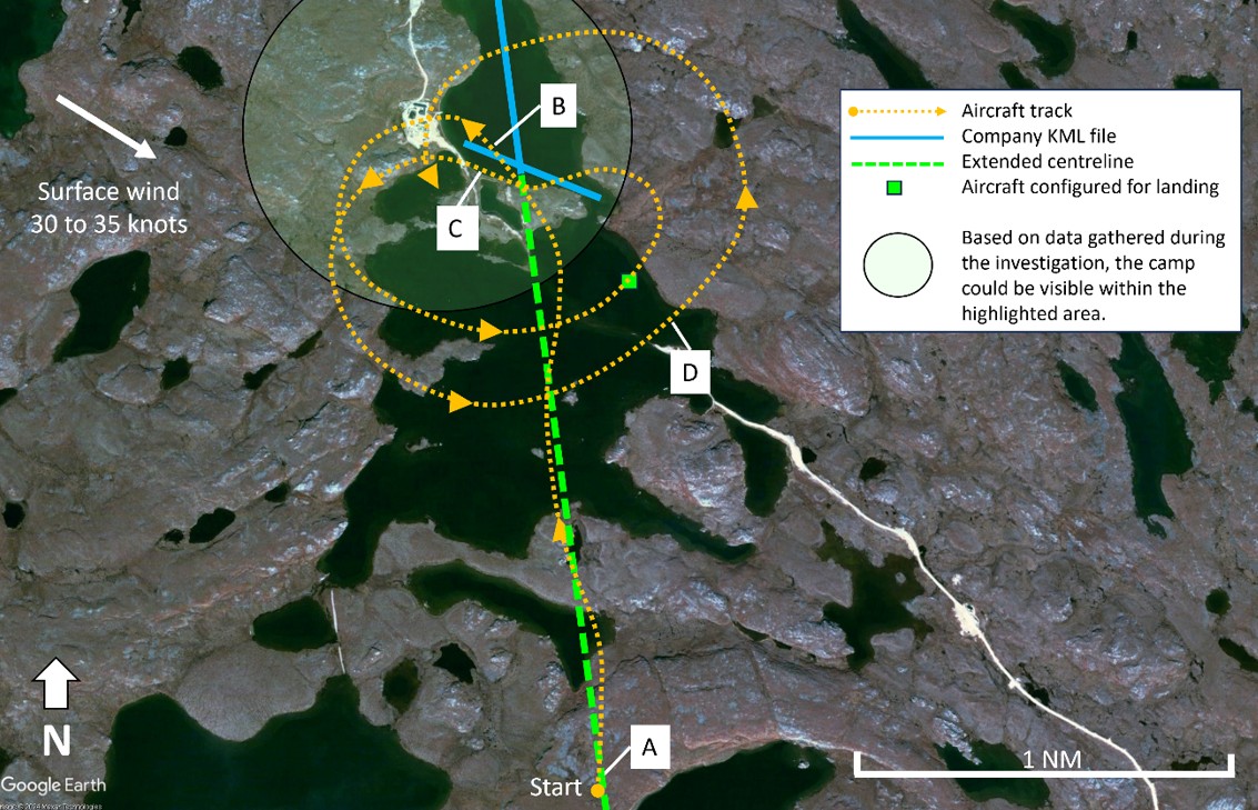 At 1228, at a distance of 1¾ NM from the Lac de Gras road camp and a height of 220 feet AGL, flaps to 10° were selected to help slow the aircraftThe flight crew spotted the road camp 1 minute later when they were at a distance of ½ NM. The aircraft overflew the road camp at 250 feet AGL and began a left-hand circuit for a visual inspection of the intended landing surface (B on Figure 2). While on the base leg for the inspection, the flight crew put the aircraft in a landing configuration,The landing configuration of flaps 20° and propellers levers full forward may also be used for inspection passes. (setting the flaps to 20° and the propellers levers full forward) (green square on Figure 2). After turning final, while overflying the desired landing surface at a height of between 50 and 100 feet AGL for the inspection pass, the flight crew was unable to differentiate the shoreline from the ice on the lake on which they intended to land and conducted a go-around (C on Figure 2).