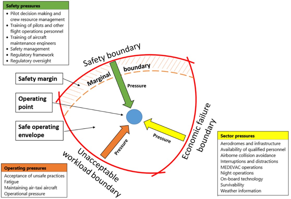 The safe operating envelope concept presented in the TSB SII on air-taxi operations, explains how the fact that Air Tindi’s operations are subject to sector pressures and operating pressures has resulted in unsafe practices being adopted. The safety pressures that would normally offer resistance to the operational pressures ended up being ineffective in the context of this occurrence in the following ways: