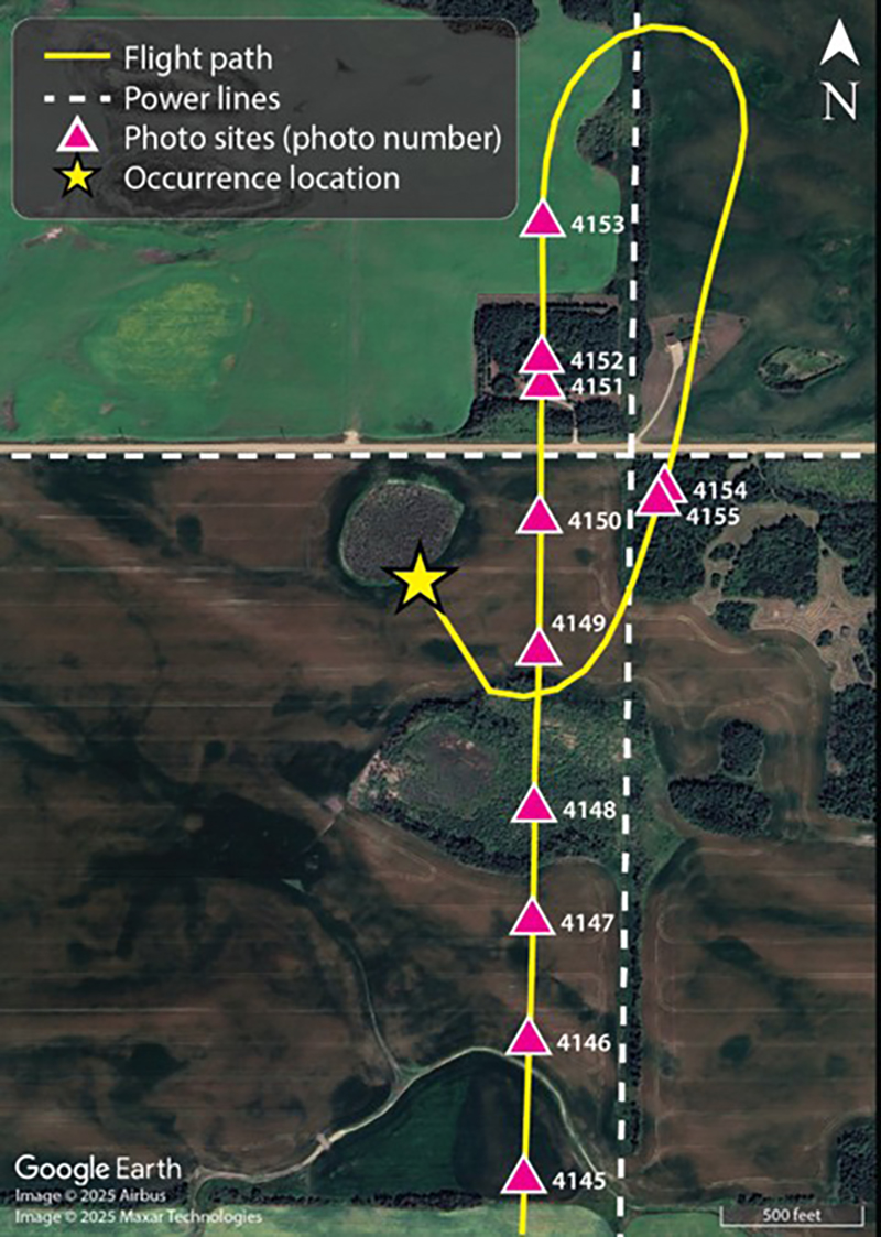 The investigation obtained photos and video from the onboard cameras. The last series of photos and video showed that the aircraft flew over an intersection of power lines that the observer photographed twice (photos 4151 and 4152 in Figure 1). The next photo (photo 4153 in Figure 1) is of the next pole in the power line. The pilot then turned approximately 190° to the right to allow the observer to take 2 additional photos (photos 4154 and 4155 in Figure 1) of the intersection of power lines.