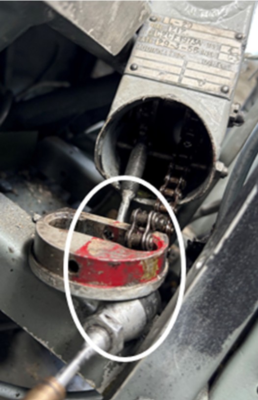 Figure 3. Red paint remaining on the chain guide at the control column pivot point once the grease was wiped off (Source: TSB)