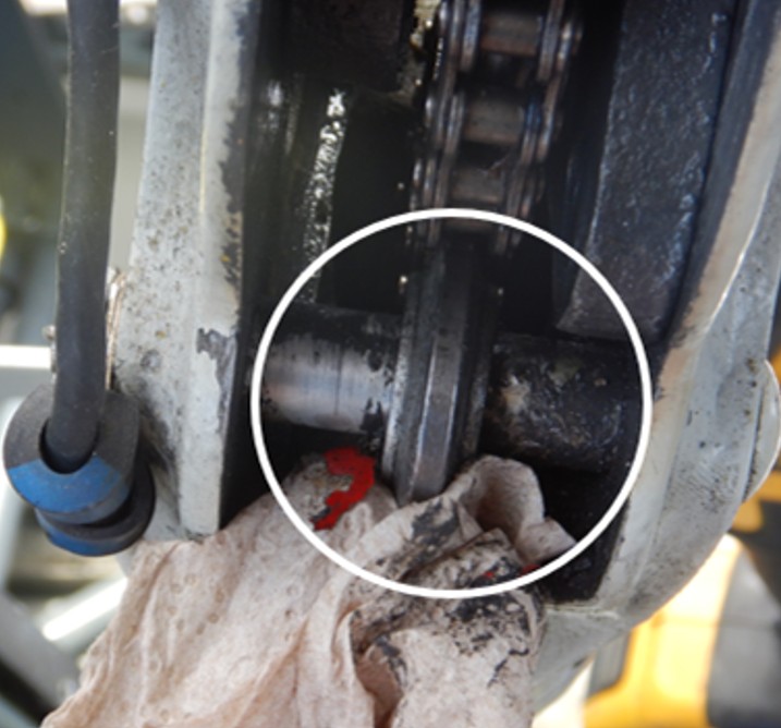 On the chain guide below the pivot point, grease was covering the spot that is normally painted red. When the grease was wiped off, very little red paint remained, and it flaked off easily (Figure 3). Other than the red paint marks, nothing in the design indicates the proper way to thread the chain or prevents the chain from being threaded the wrong way.