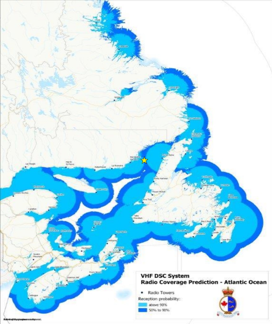The Radio Aids to Marine Navigation shows the predicted radio coverage of the Canadian Coast Guard’s (CCG’s) coast stations and shore-based antennas along Canada’s Atlantic coast, which is part of sea area A1. When comparing the radio carriage requirements for vessels operating in the Gulf of St. Lawrence, which is considered sea area A1 under the Navigation Safety Regulations, 2020, with the predicted radio coverage provided in the Radio Aids to Marine Navigation, there are sectors within this area that have no calculated probability of VHF radio coverage from coast stations, meaning that communication between coast stations and vessels within those sectors will not be successful. This also means that a distress alert initiated over VHF-DSC radiotelephone in those sectors will likely not be received by a shore-based radio station.