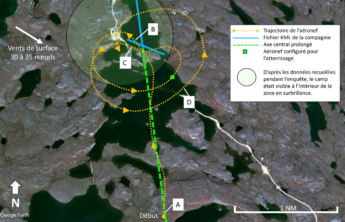 Lorsque l’aéronef est arrivé dans la région, l’équipage de conduite n’a d’abord pas été en mesure de déterminer sa position par rapport au camp routier sans l’aide de ses OEPP, et il a décidé d’utiliser une approche aux instruments improvisée pour mener le vol à terme. L’approche VFR conçue par la compagnie fournissait le guidage dont l’équipage de conduite avait besoin pour trouver le camp routier. Au cours des tentatives d’atterrissage au camp routier du lac de Gras, l’équipage de conduite a systématiquement repéré à vue le camp routier à une distance de ½ mille marin (NM).